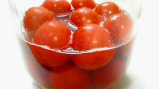 竹串で数箇所穴をあけたミニトマトを半日以上漬ければできあがりです。